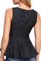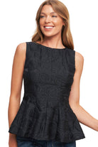 A textured woven top featuring round neckline, sleeveless, peplum and back zipper closure