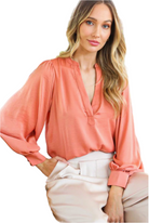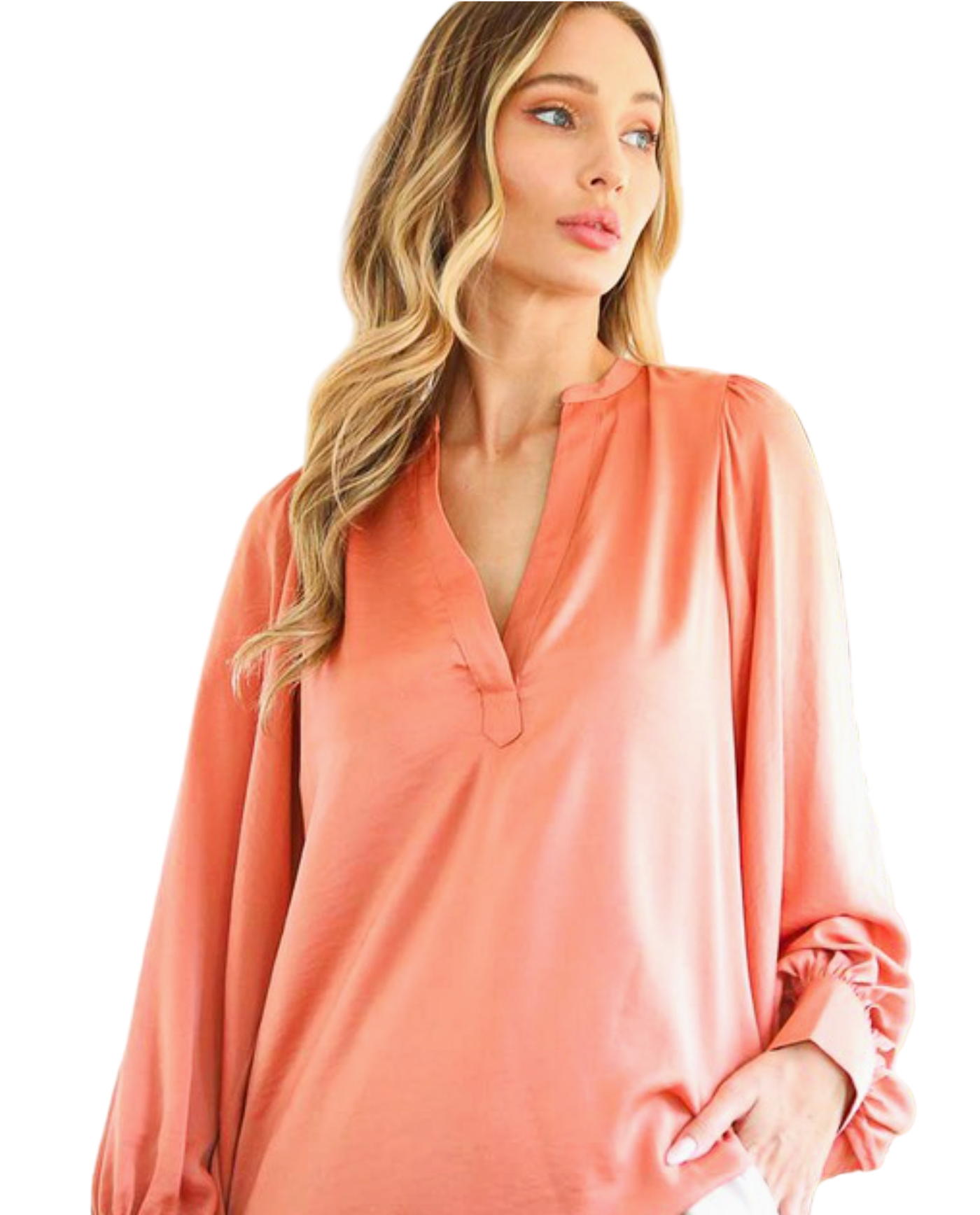 • Long balloon sleeve with buttoned cuffs - Back dart detail - Comfortable, Relaxed fit - Washed satin top - Soft touch.