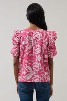 Introducing the Valen Top, the perfect addition to your wardrobe for keeping things flowy and effortless. This top features a tonal outlined floral print, a V-neckline, and a straight fit framed by ruched quarter length sleeves. Made from bubble crepe, it's the ideal top to wear tucked into high waisted trousers for a chic look. Available in Pink White. Size + Fit: Model is 5'9" and wearing size XS.