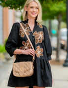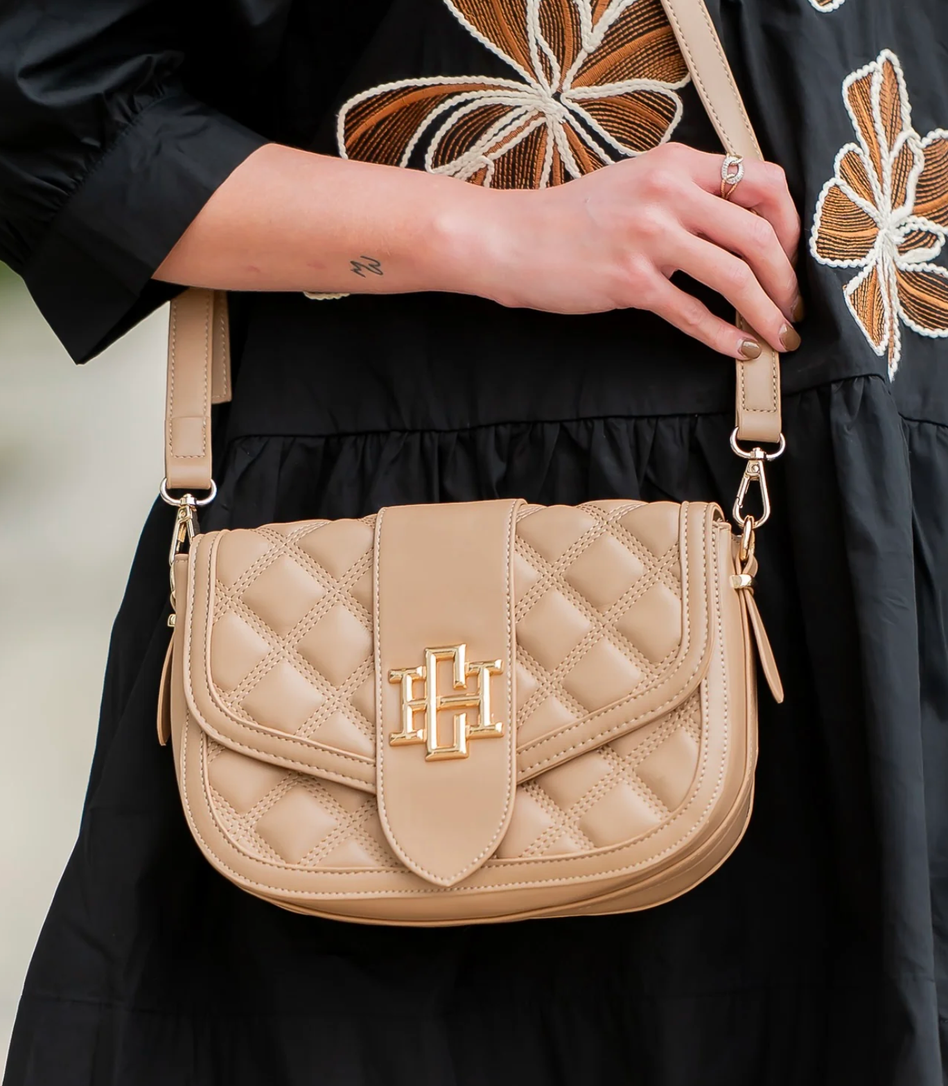 The George Crossbody Bagis made from soft faux lambskin with timeless diamond quilting, it showcases the signature shiny gold embellishment on a magnetic flap. Inside, stay organized with a zippered pocket and two open compartments, while its structured design keeps the bag looking polished all day. Adjustable Strap for ultimate comfort.