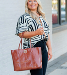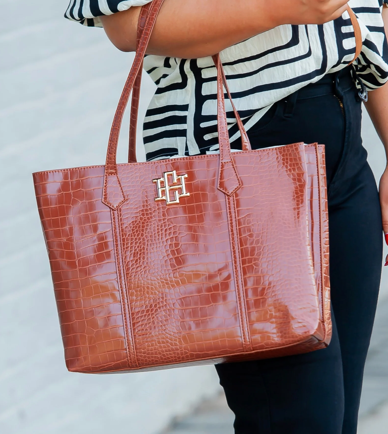 The Gibson Tote Bag in Saddle combines chic style with everyday functionality. Its embosses croc texture and structured shape add sophistication, while the roomy interior keeps essentials organized with a large center zippered compartment. The open-top design allows quick access, and the smooth vegan leather lining enhances durability and elegance. This tote is perfect for those who want a fashionable yet practical on-the-go companion.