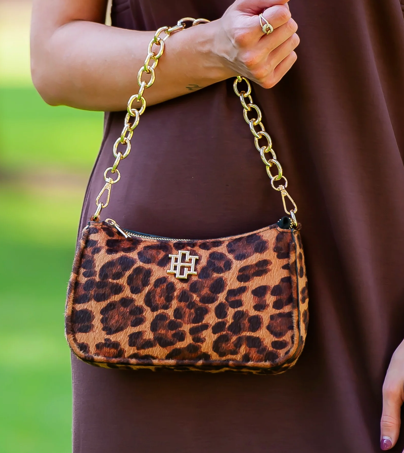 This fabulous vegan leather crossbody is a wonderful size for travel and everyday wearing! It is made with a slightly metallic, textured vegan leather. There is a removable chain accent that can also be used as a carrying strap as well. The crossbody strap is adjustable and removable as well. It has a top zipper closure. The interior of the bag has a zippered pocket and two short open pockets as well.