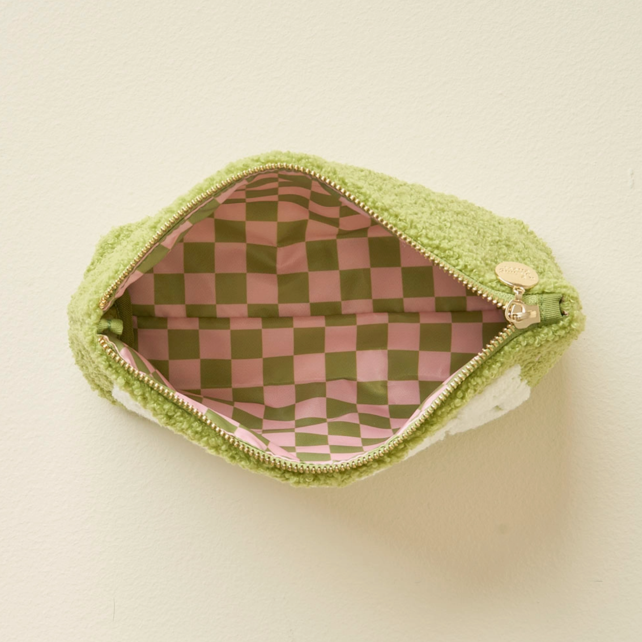 Add a cozy touch to your essentials with our rectangle teddy pouches. Crafted from soft sherpa fabric, these pouches feature a wipeable lining for easy cleaning and gold zippers and hardware for a polished look. The interior is lined with a fun printed fabric, making it as stylish on the inside as it is on the outside.