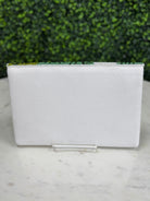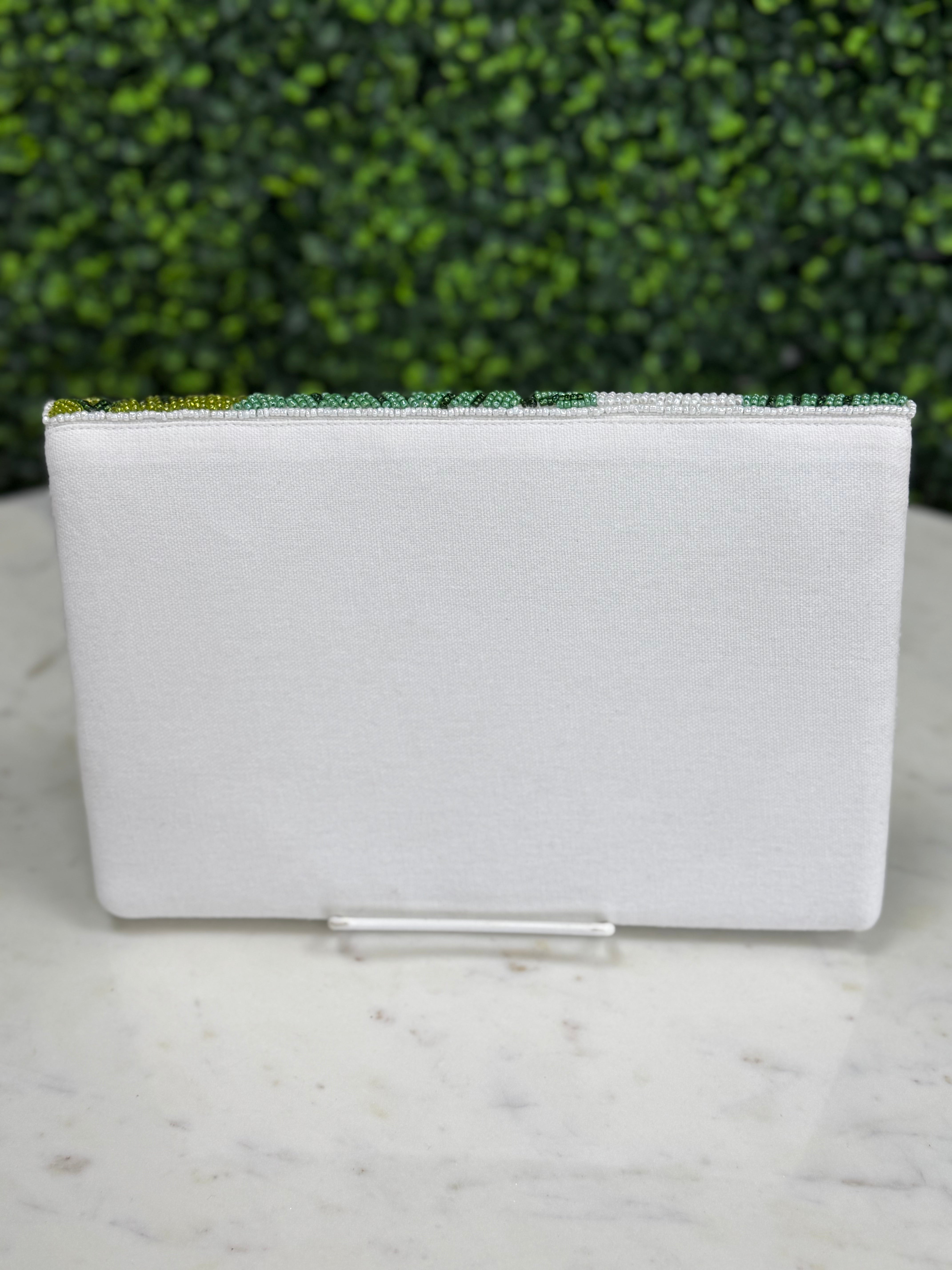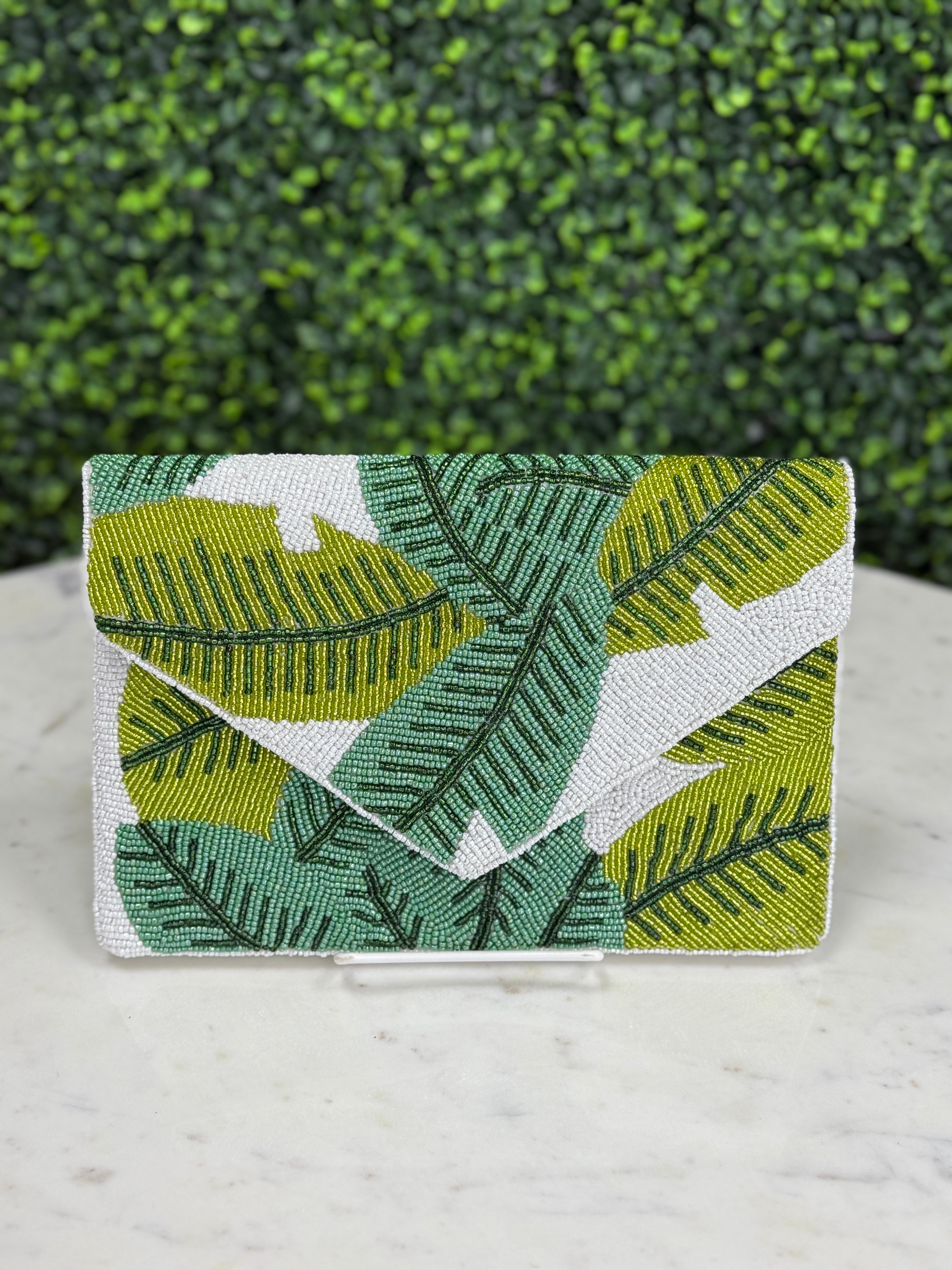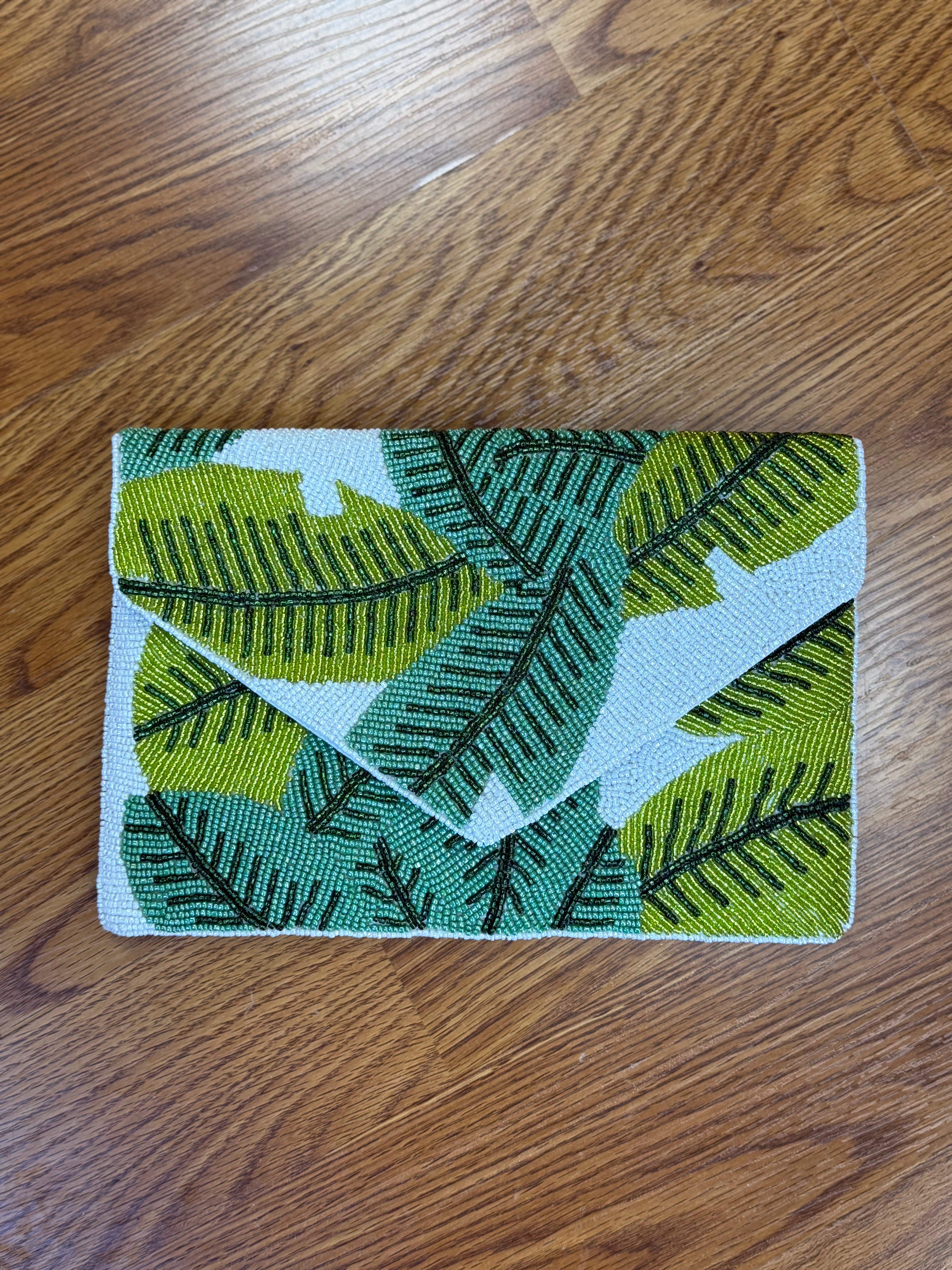 Handcrafted in India, this clutch features vibrant beadwork in a stylish palm leaf pattern, perfect for evoking summer vibes and chic, exotic flair. The clutch’s 100% cotton interior and backing offer both durability and comfort, while the interior pocket ensures your essentials stay organized. Designed with a secure magnetic snap button closure and a detachable crossbody chain, it provides versatility and ease of use.