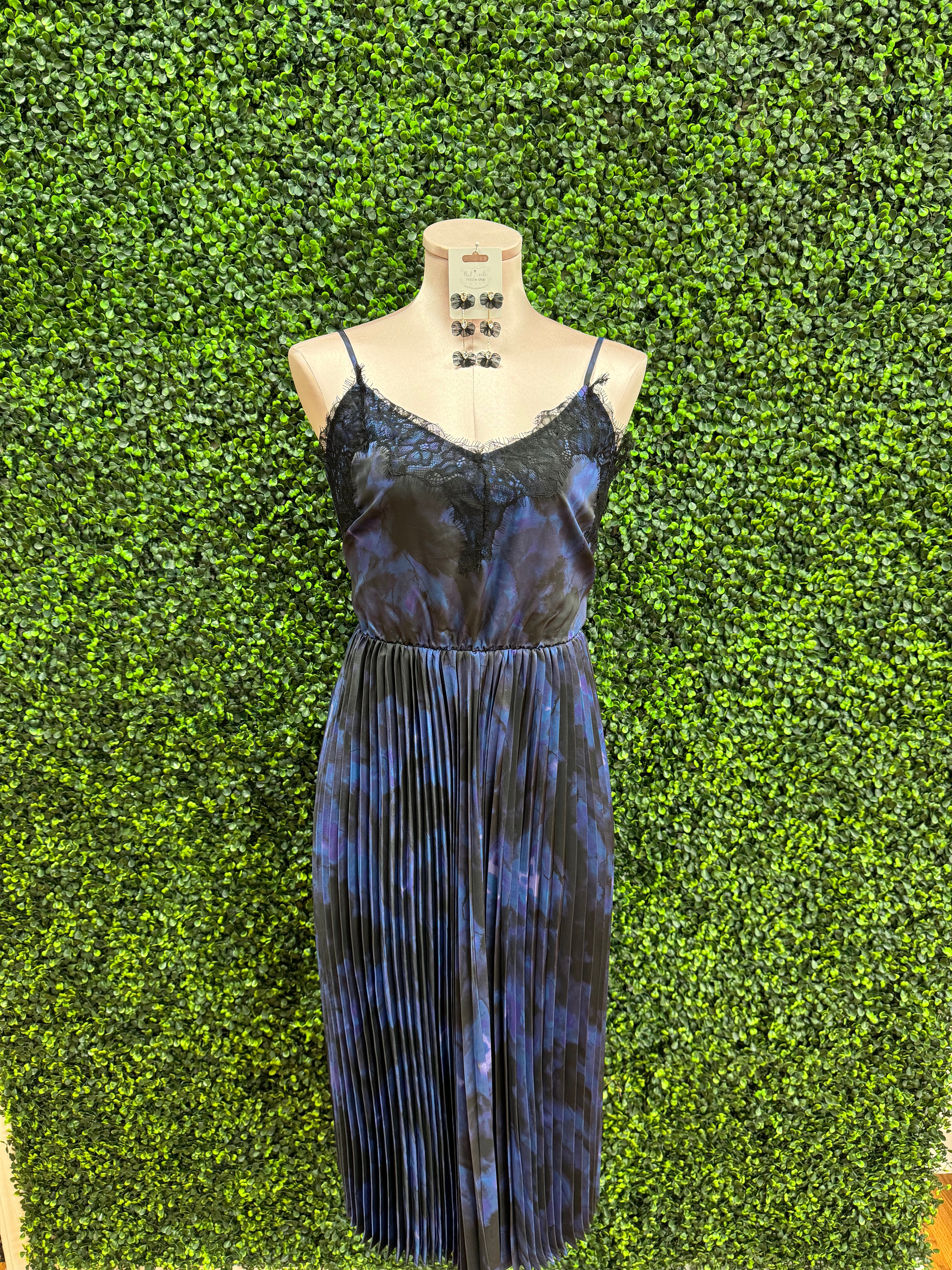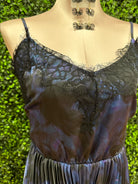 Elevate your style with the Linzie Dress! This stunning midi dress boasts a sleek black and blue color scheme with a delicate lace detail neckline. Adjustable straps ensure a perfect fit while adding versatility. Make a statement in this classic and elegant piece.