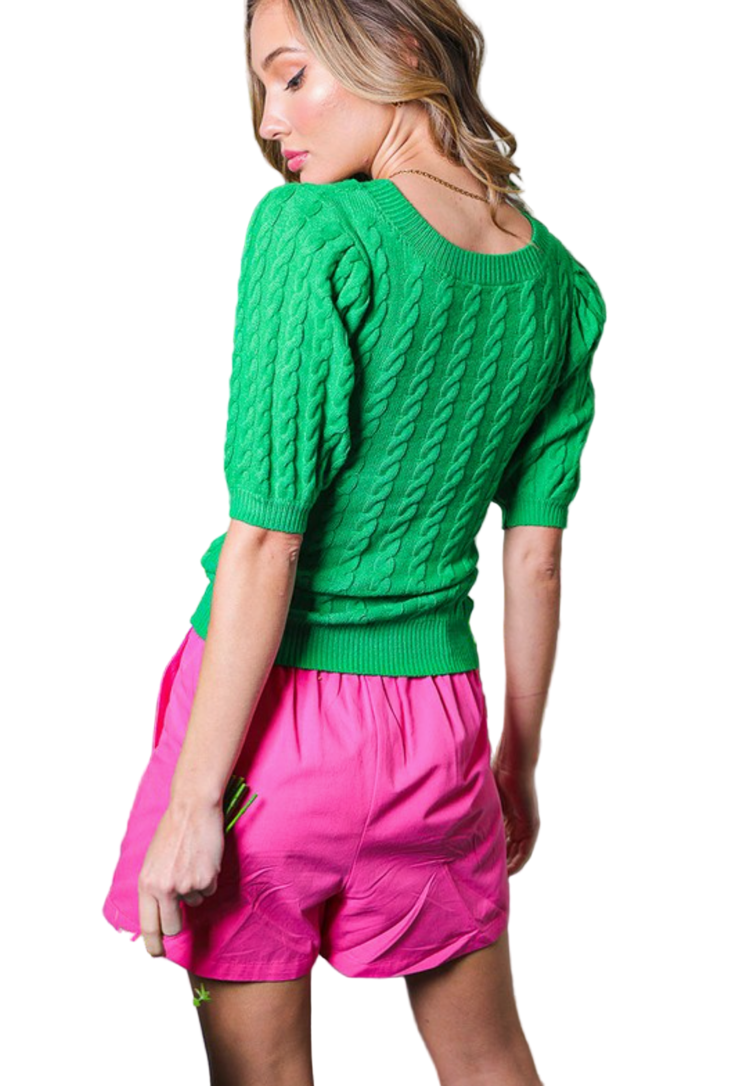 - Short puff sleeve ribbed hem - Cable pattern detail - Pullover style - Soft touch - This Crew neck sweater is characterized by a novelty cable-knit pattern