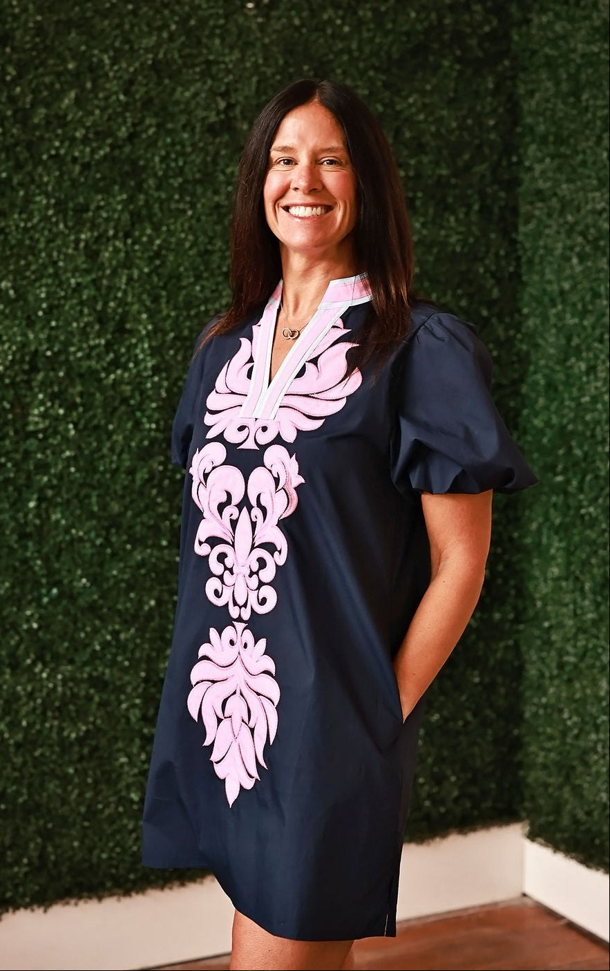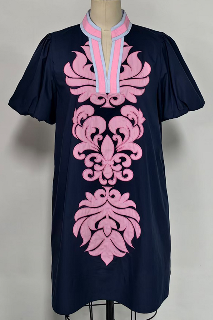 The Bodi Dress Navy features an elegant baroque applique detail that elevates its classic shift silhouette. Short puff sleeves frame the shoulders while a standing neckline with notched V-neck creates refined visual interest. The relaxed shift cut offers comfortable, flattering wear for various occasions. True to size, this piece works beautifully layered or worn solo for understated sophistication.