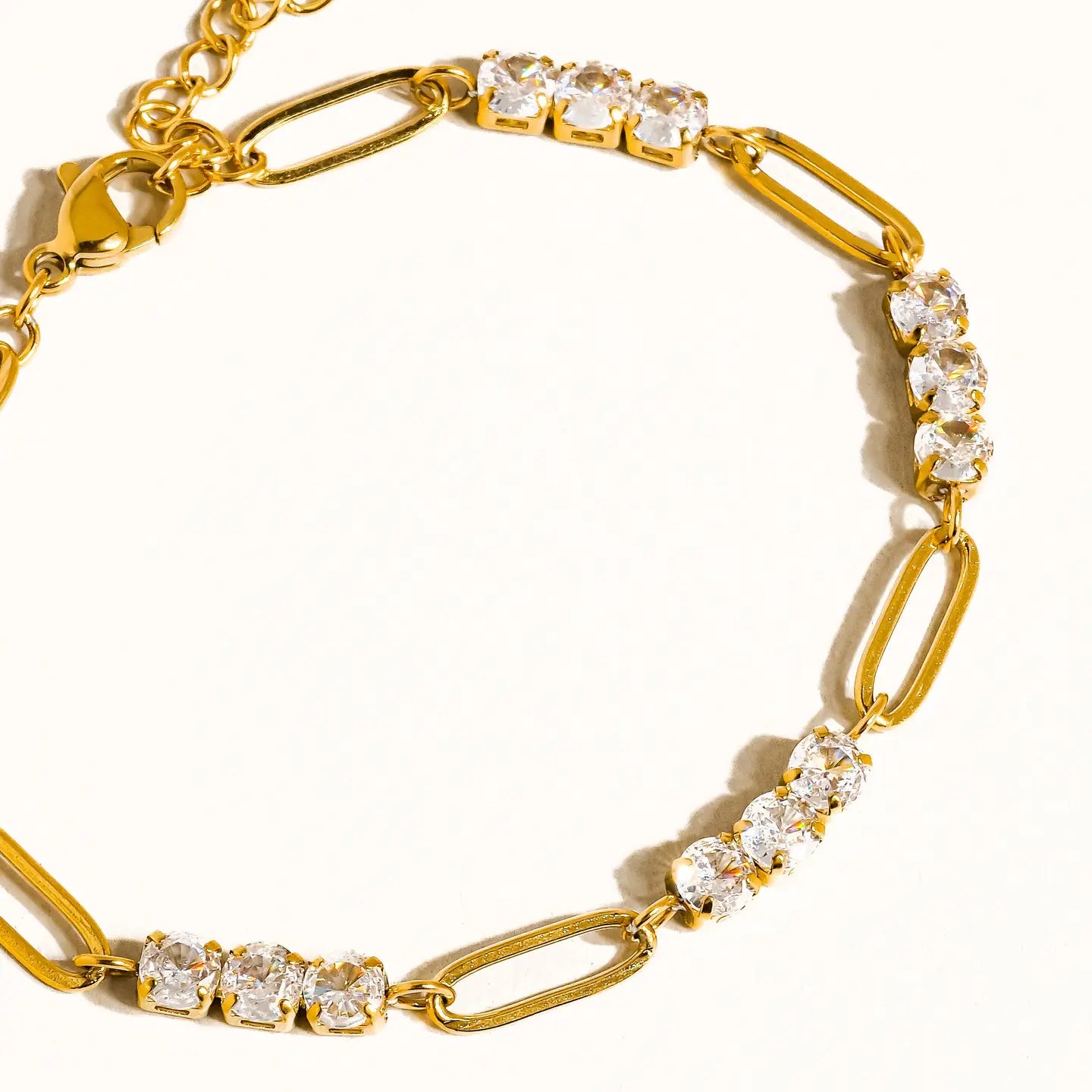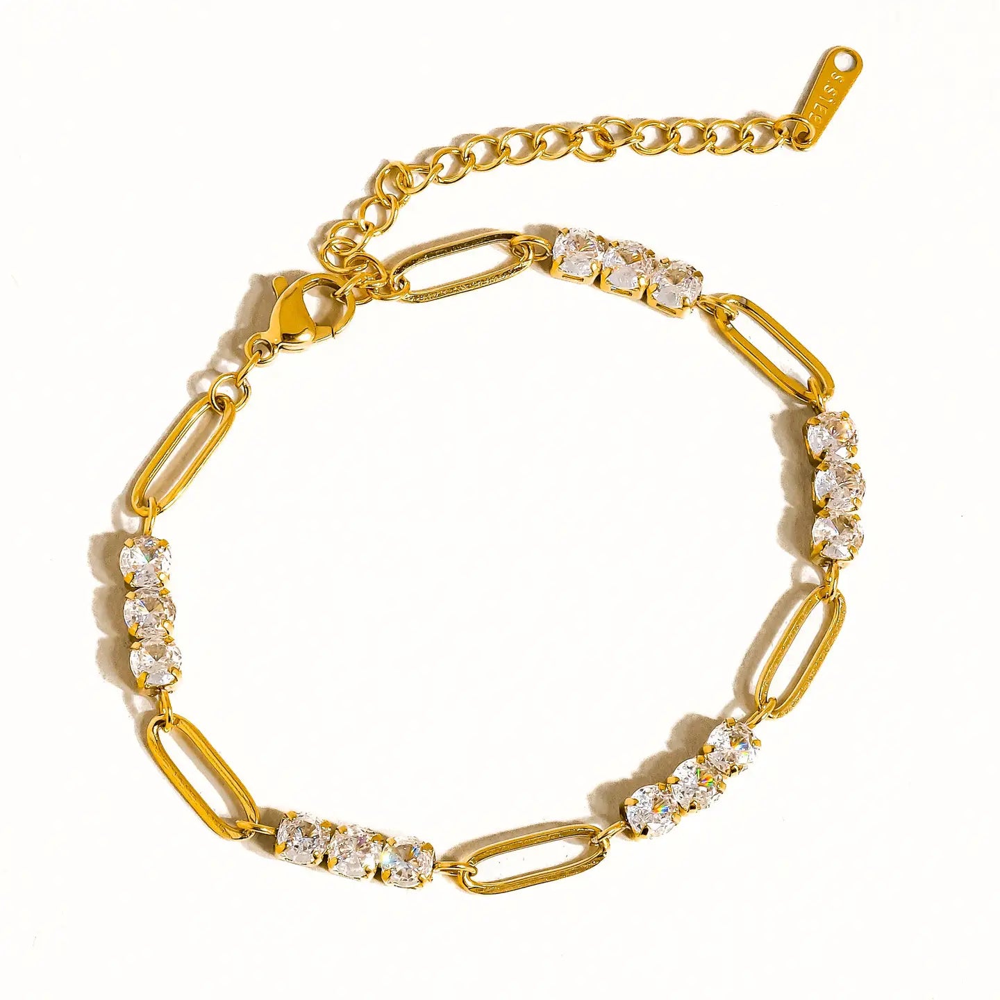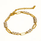 Sparkle with confidence in the Danielle Bracelet, where timeless elegance meets everyday wearability. This stunning piece features 18K gold plating over hypoallergenic stainless steel, adorned with shimmering rhinestones that catch the light beautifully. Designed for sensitive skin with lead-free and nickel-safe materials, it's water-resistant enough for your active lifestyle. The delicate 6.49-inch chain adjusts with a 1.96-inch extension for the perfect fit, while the petite 0.15-inch pendant adds just the right touch of glamour without overwhelming your wrist.