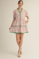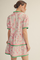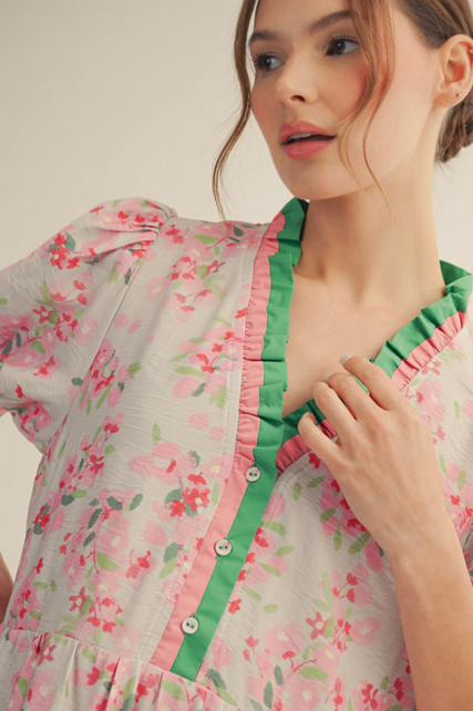 The Jenni Dress combines romantic details with practical functionality. Featuring delicate puff sleeves and a tiered silhouette, this piece showcases a charming floral print with solid contrast accents. The ruffled neckline adds dimension, while the front button-up closure allows for easy styling versatility. Functional side pockets provide everyday convenience. An ideal choice for those seeking feminine elegance with wearable comfort.