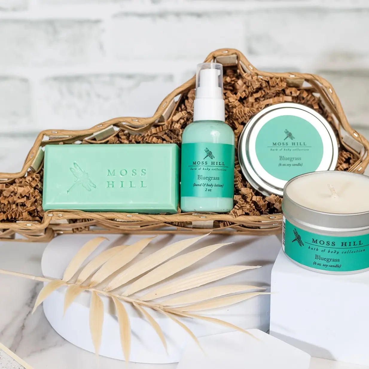 This Kentucky shaped basket in Mint Julep scent features a lovely selection of our products: a soap, candle, and small lotion. A wonderful gift for everyone!