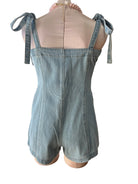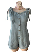 The Mackenzie Romper is a breezy denim essential designed for warm weather comfort. Featuring classic button detailing and adjustable ties, this versatile piece transitions effortlessly from casual outings to weekend adventures. The relaxed fit and breathable fabric make it an ideal choice for spring and summer styling. Pair it with sneakers for a laid-back look or dress it up with sandals for a polished finish.