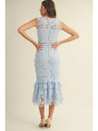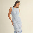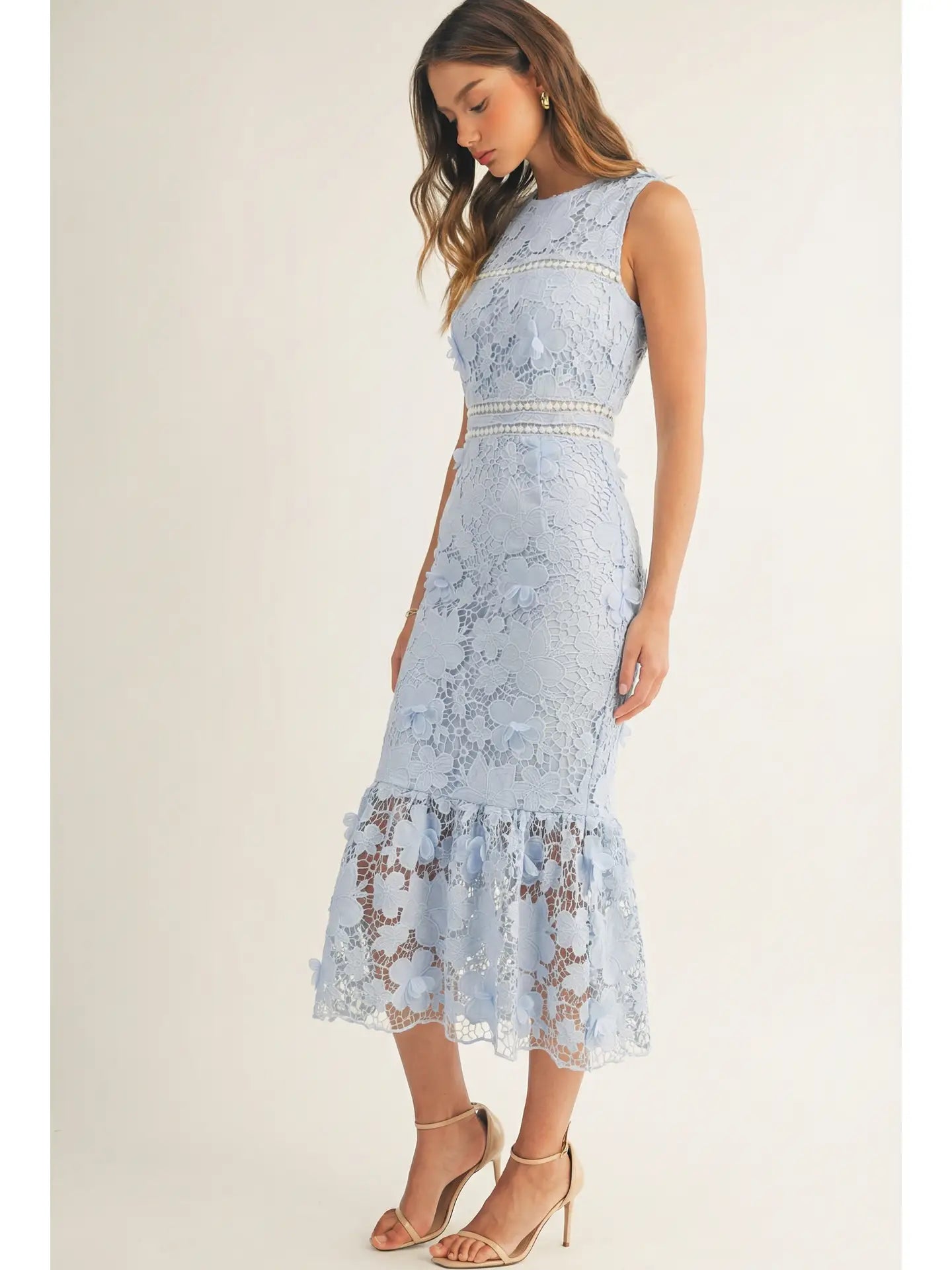 Elegant and figure-flattering, this dusty blue midi dress features intricate floral lace with dimensional 3D appliqué detailing throughout. Designed with a sleeveless silhouette and modest round neckline, it offers a refined and timeless look perfect for formal occasions. The fitted bodice and waist are accentuated with delicate trim detailing, flowing into a subtle mermaid-style hem that adds graceful movement and feminine drama. A back zipper closure ensures a secure and tailored fit, while the dress is fully lined for comfort. Perfect for wedding guests, engagement parties, formal events, and elevated boutique occasion assortments.