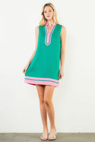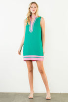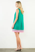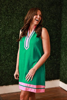 The Nita Dress is your go-to piece for effortless style with a modern twist. This sleeveless beauty features a chic split neckline and eye-catching contrast trim that brings personality to any occasion. The kelly green and pink color combo strikes the perfect balance between bold and wearable, making it ideal for everything from brunch dates to evening outings. Slip it on and let the playful design do the talking.