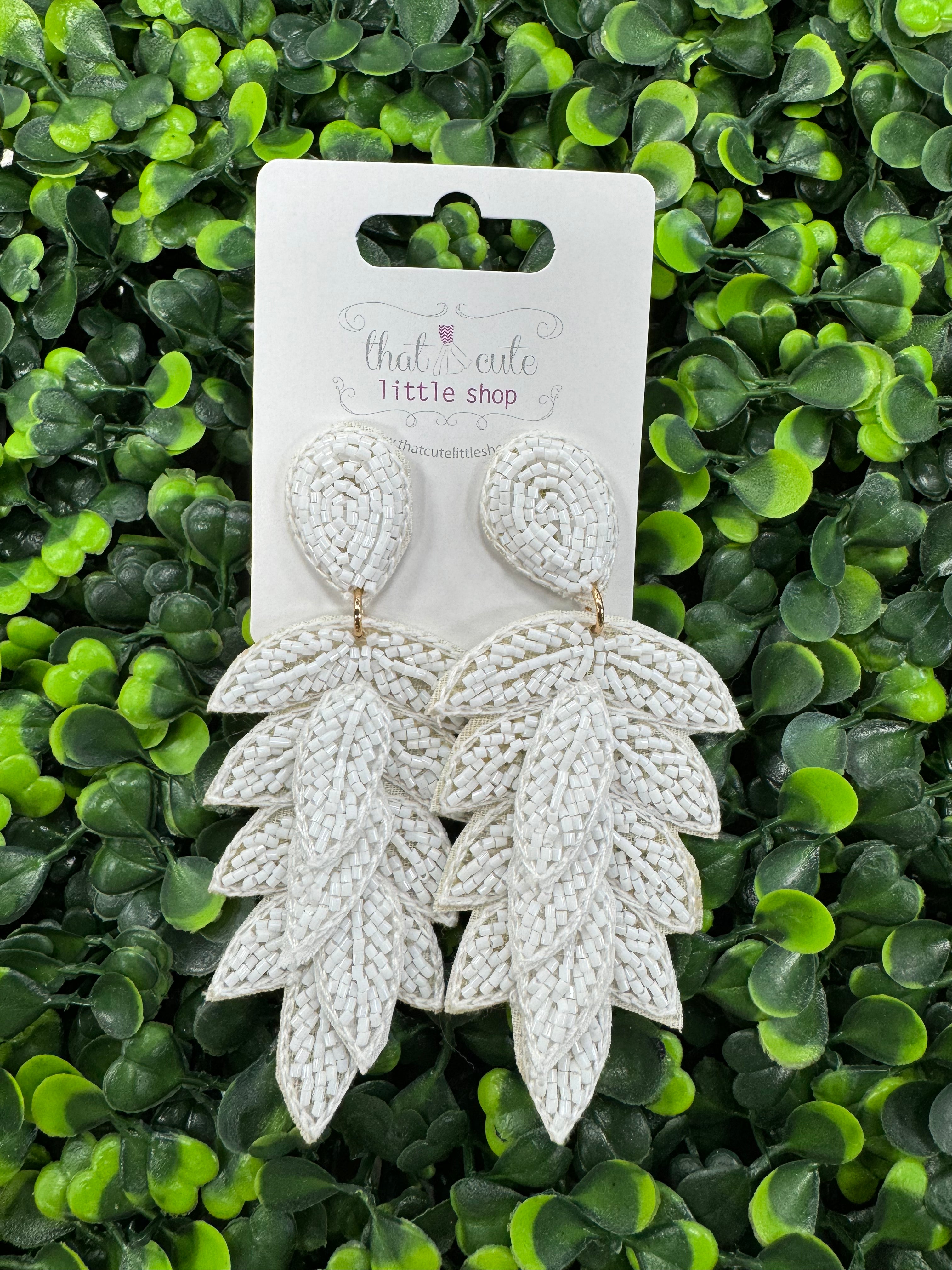 Introducing the Olivia Earrings! These unique earrings feature a stunning white tiered leaf design, perfect for adding a pop of color and style to any outfit. Stand out from the crowd with these one-of-a-kind earrings.