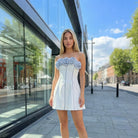 A feminine ivory mini dress featuring a structured corset-inspired bodice with contrast seam detailing that enhances the silhouette. The neckline is adorned with voluminous ruffle trim in a contrasting striped fabric, adding texture and playful dimension. Slim shoulder straps provide support, while the fitted waist flows into a softly flared A-line skirt for a flattering shape. The back is finished with smocking for comfort and flexibility. Perfect for summer parties, bridal events, or statement daytime looks.