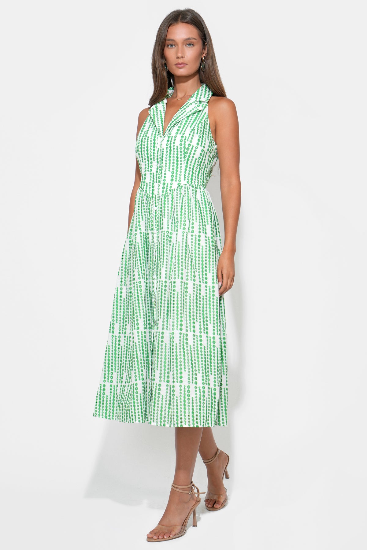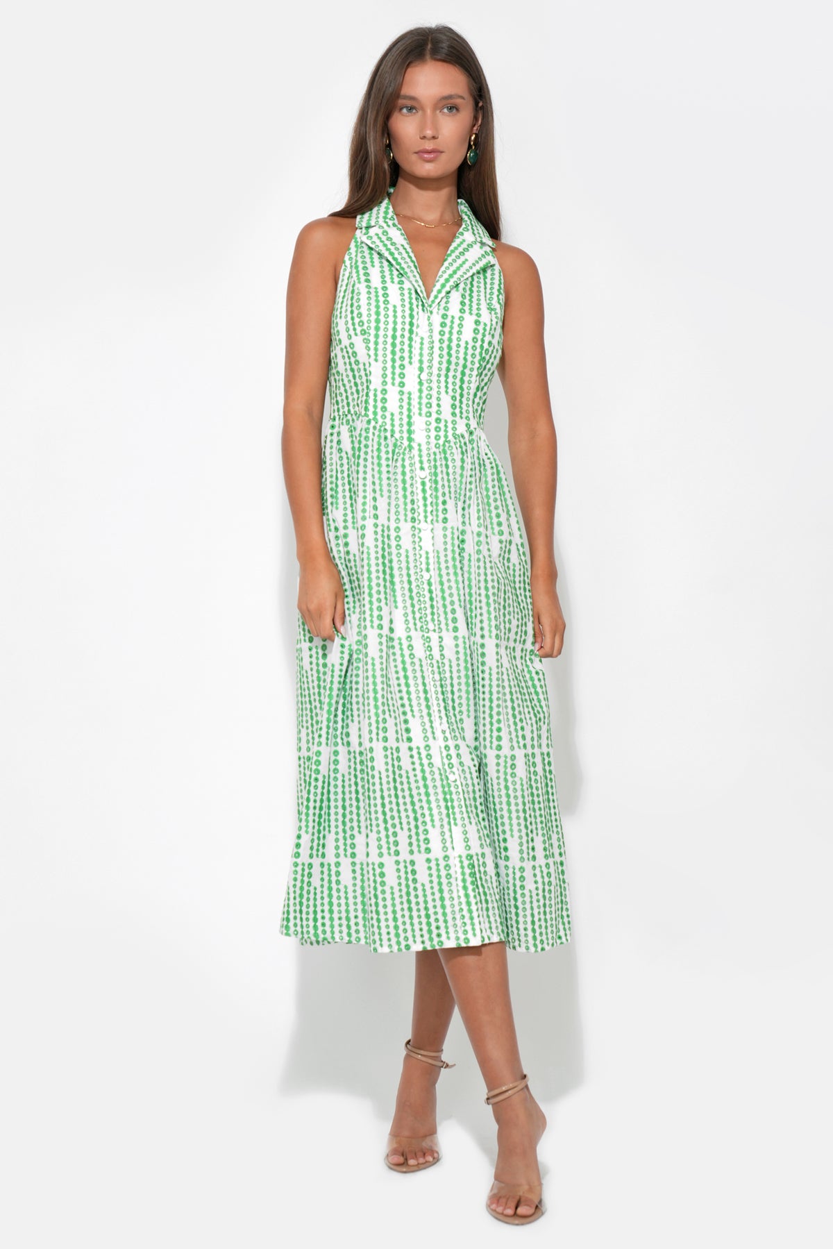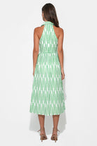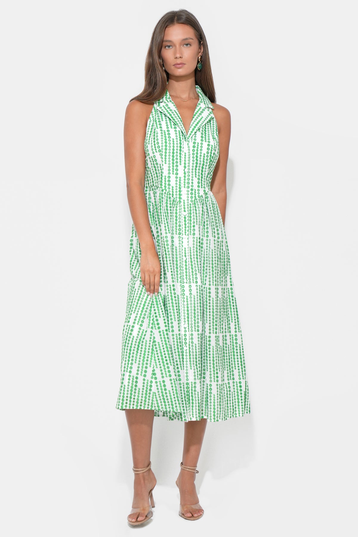 The halter neckline provides a sophisticated, shoulder-baring silhouette that feels both secure and elegant, often leading to a graceful open-back or tie detail. Crafted from a structured woven fabric (like a cotton-linen blend or premium poplin), the midi-length dress holds a gentle A-line shape that moves with effortless poise.